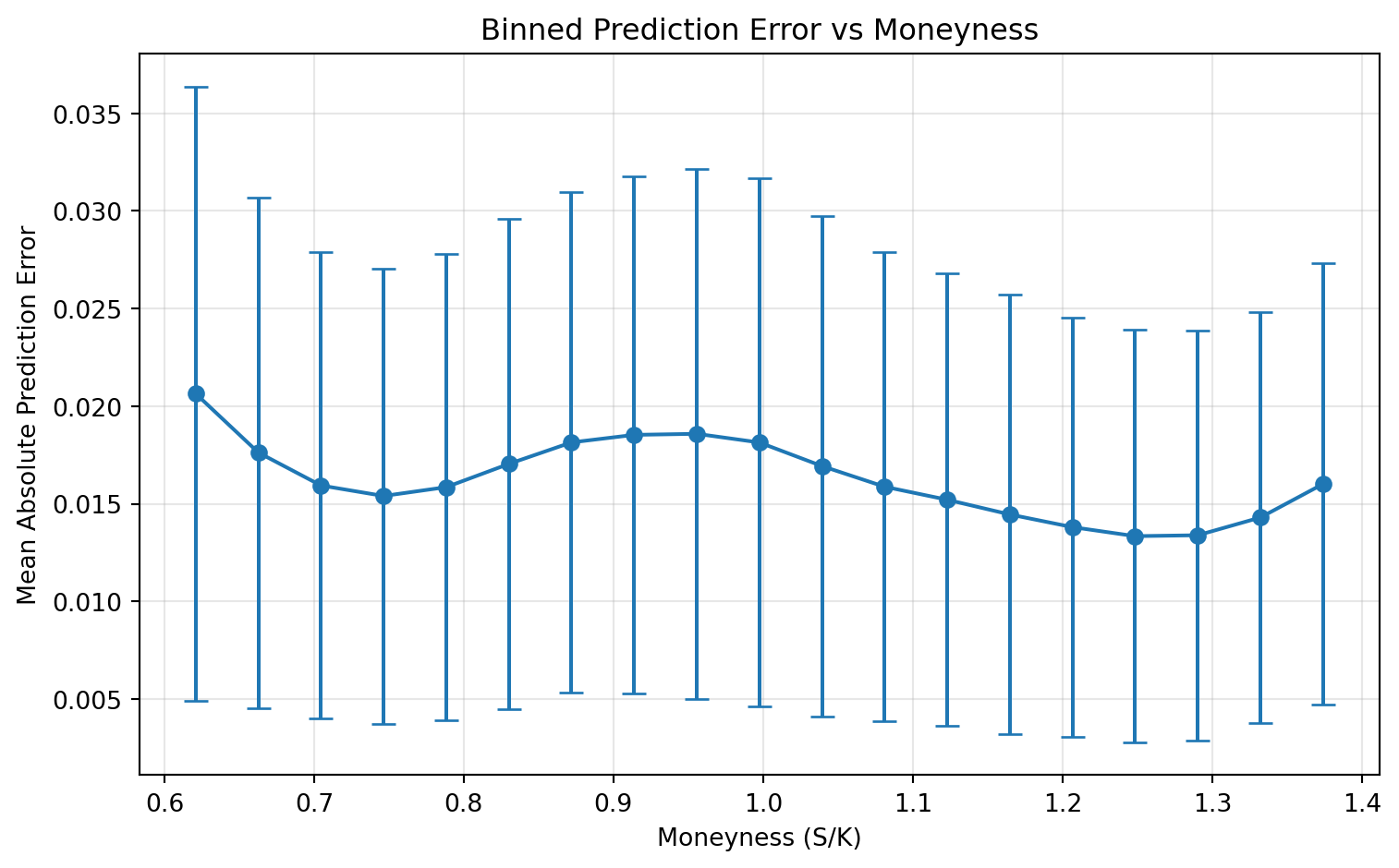 We also compute absolute pricing errors on the test set and analyze them against moneyness. This diagnostic shows where the model is strong or weak across the state space, not only the average error level.