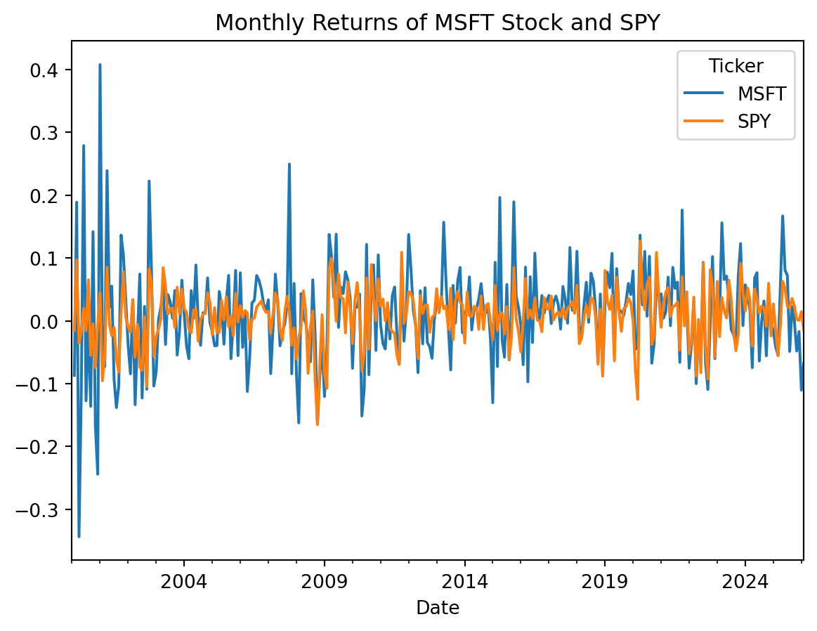 There is, however, a strong co-movement between the returns of MSFT and SPY. To see this, we could regress the monthly MSFT returns on the monthly SPY returns as: