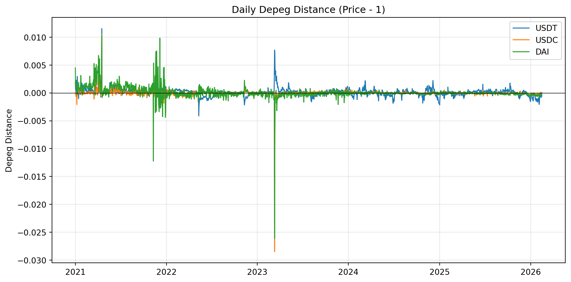 Our main variable is depeg distance: d_{i,t} = P_{i,t} - 1, which is positive when a token trades above $1 and negative when it trades below $1.