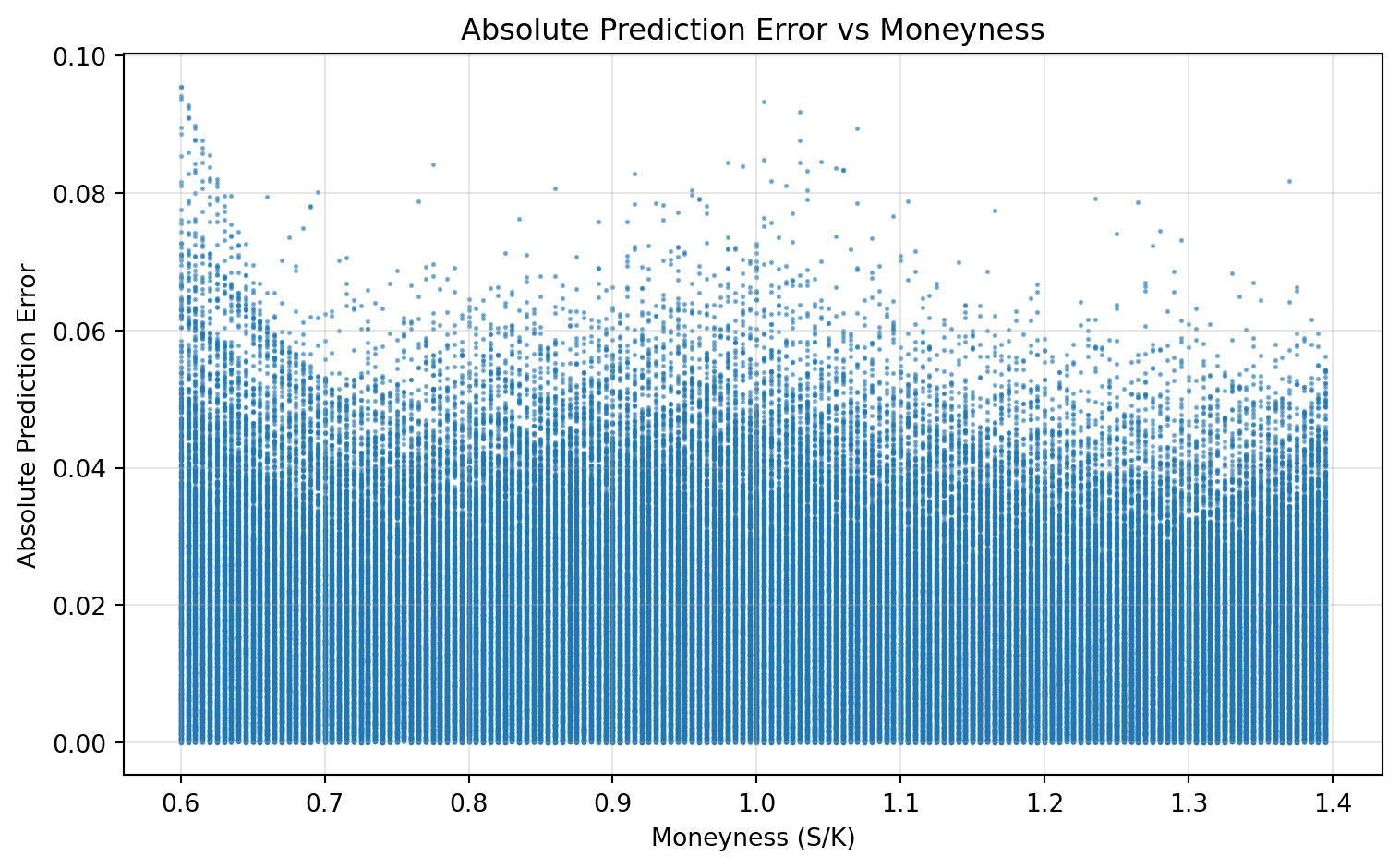 We also compute absolute pricing errors on the test set and analyze them against moneyness. This diagnostic shows where the model is strong or weak across the state space, not only the average error level.