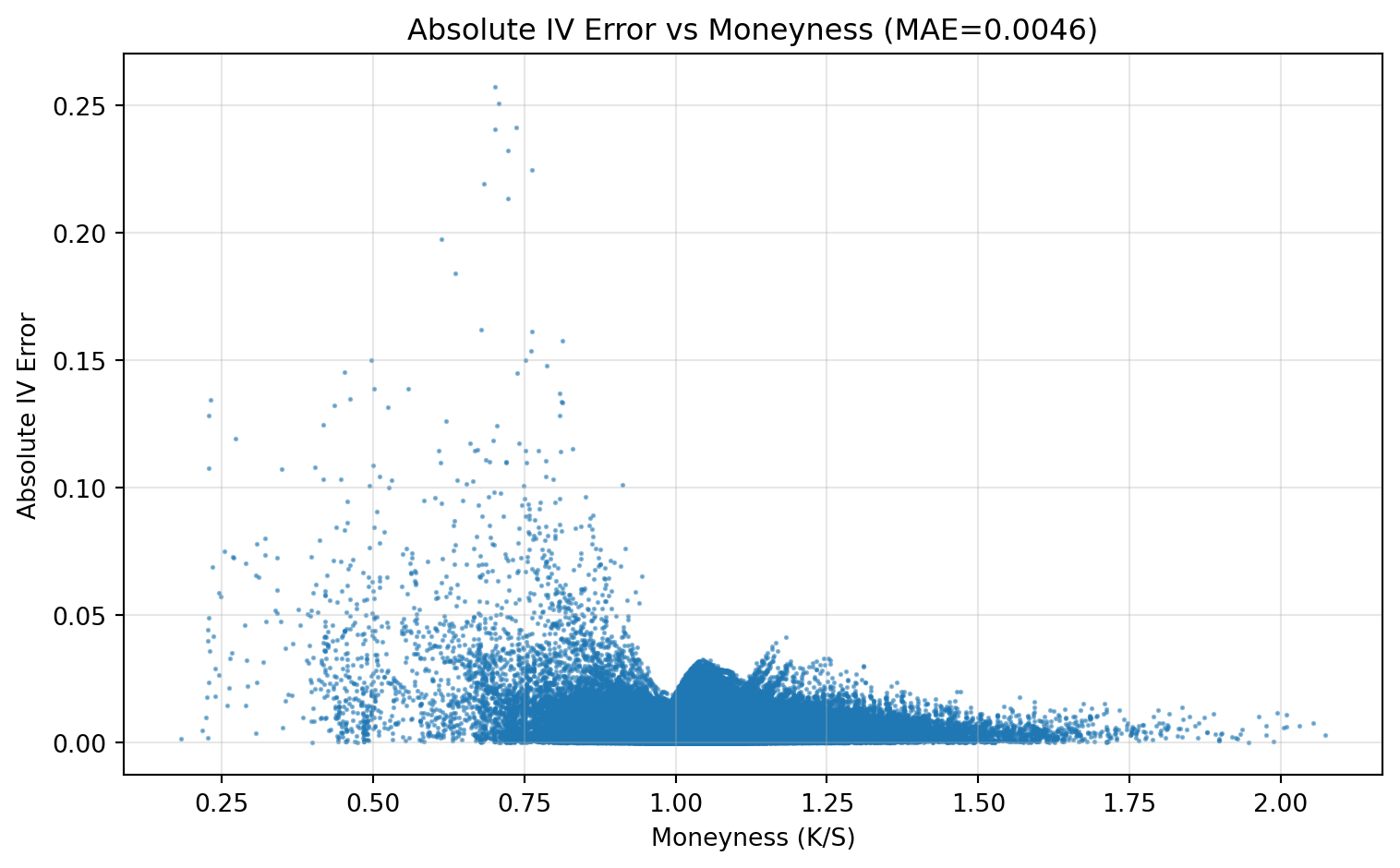 - Whether errors are systematically larger in specific moneyness regions (for example deep OTM/ITM).