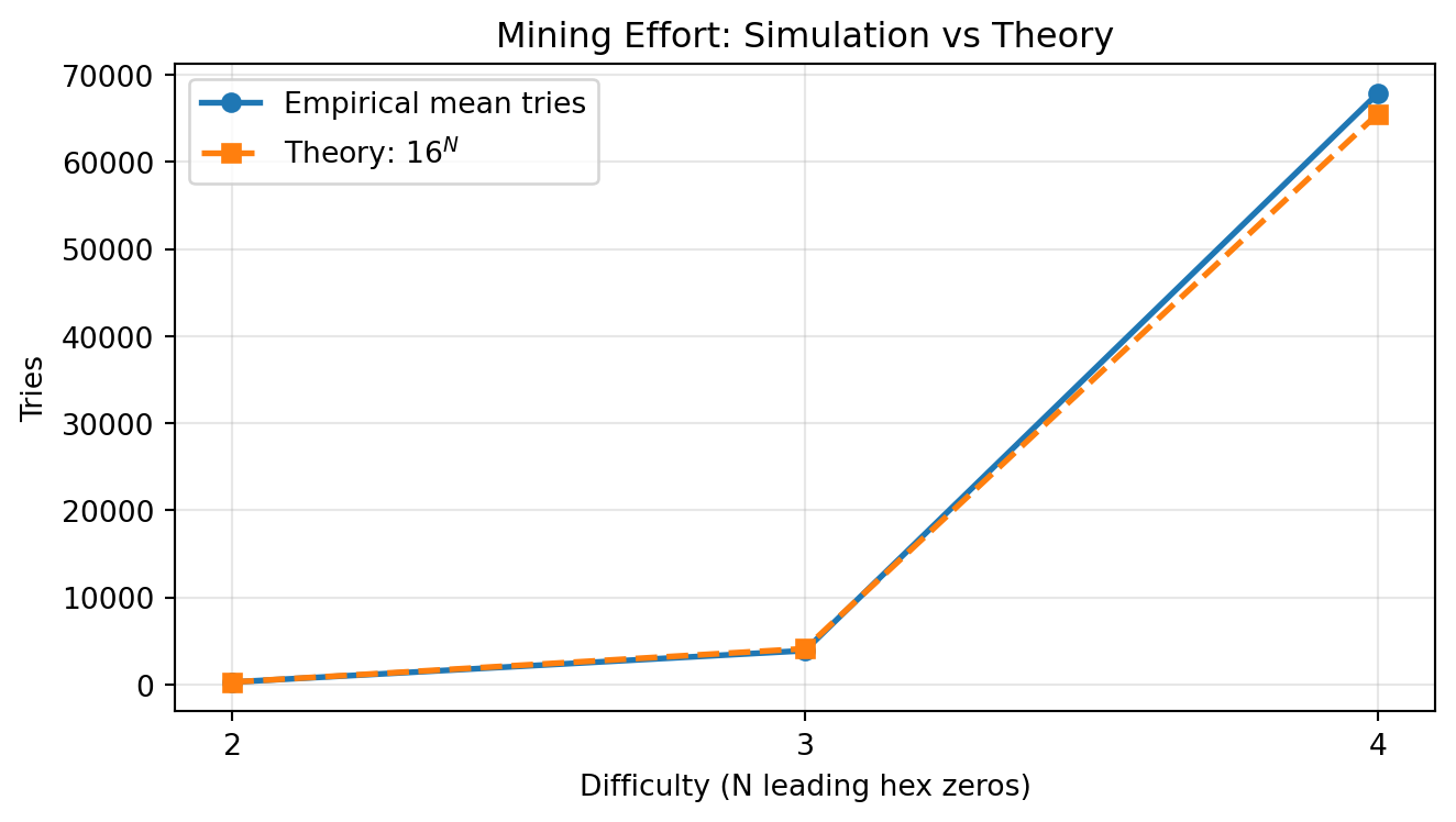 These results empirically confirm the exponential scaling predicted by the geometric model. Even at modest difficulty (N=4), the expected number of hash attempts already reaches tens of thousands — illustrating why increasing difficulty rapidly raises the bar for successful mining and for rewriting history.